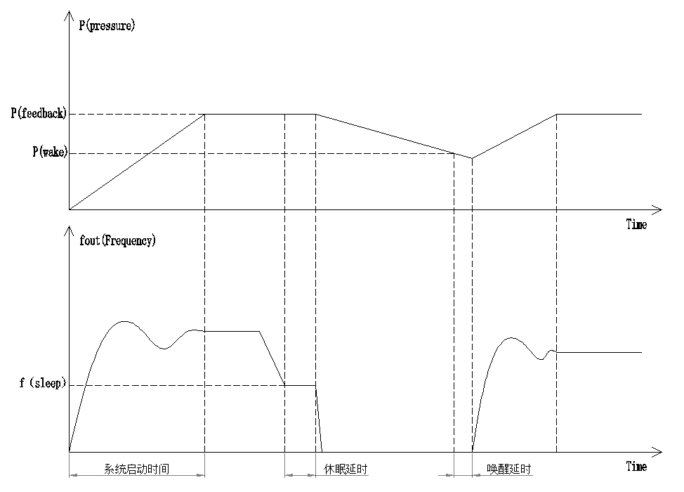在恒壓供水控制系統(tǒng)中,為了節(jié)省電能和防止水泵頻繁啟停,要求當(dāng)泵的速度低至輸出頻率下限,延時一段時間后變頻器自動停止輸出,進入休眠狀態(tài);然后當(dāng)壓力反饋值低于設(shè)定壓力下限值時,再自動喚醒變頻器。