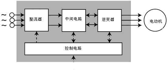 變頻器是把工頻電源(50Hz或60Hz)變換成各種頻率的交流電源,以實(shí)現(xiàn)電機(jī)的變速運(yùn)行的設(shè)備。如圖1所示,其中控制電路完成對主電路的控制,整流電路將交流電變換成直流電,直流中間電路對整流電路的輸出進(jìn)行平滑濾波,逆變電路將直流電再逆變成交流電。對于如矢量控制變頻器這種需要大量運(yùn)算的變頻器來說,有時還需要一個進(jìn)行轉(zhuǎn)矩計(jì)算的CPU以及一些相應(yīng)的電路。