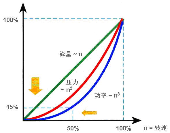 正如前面提到的,軸功率P與轉(zhuǎn)速n的三次方成正比。采用變頻器進(jìn)行調(diào)速,當(dāng)流量下降到80%時,轉(zhuǎn)速也下降到80%,而軸功率N將下降到額定功率的51.2%,如果流量下降到60%,軸功率N可下降到額定功率的21.6%,當(dāng)然還需要考慮由于轉(zhuǎn)速降低會引起的效率降低及附加控制裝置的效率影響等.即使這樣,這個節(jié)能數(shù)字也是很可觀的,因此在裝有風(fēng)機(jī)水泵的機(jī)械中,采用轉(zhuǎn)速控制方式來調(diào)節(jié)風(fēng)量或流量,在節(jié)能上是個有效的方法。
