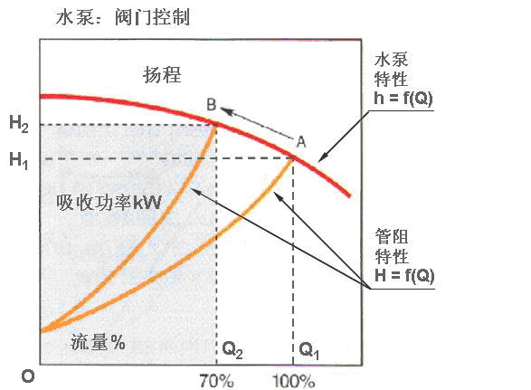 電機(jī)在恒速運行時,采取調(diào)節(jié)閥門的辦法獲得70%的流量(工作點為 B),將導(dǎo)致管阻增大,水泵軸功率相當(dāng)于Q2BH2O所包容的面積,所以軸功率下降不大。