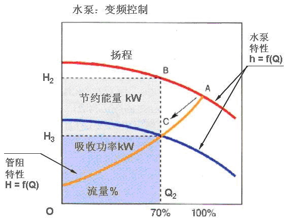 采用變頻調(diào)速控制流量時,由于管道特性沒有改變,水泵特性發(fā)生變化(工作點為 C),軸功率與Q2CH3O所包容的面積成正比。故其節(jié)能量與CBH2H3所包容的面積成正比,輸入功率大大減小。 如圖3所示: