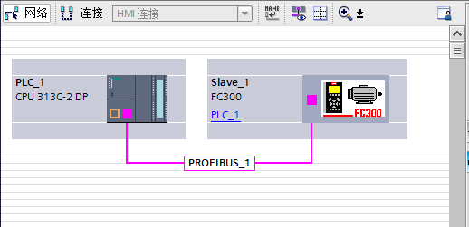 將變頻器 FC300 拖動到 PROFIBUS_1 連接線處后,PLC 和變頻器連接在一起,F(xiàn)C300 顯 示為未分配。