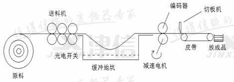 按上述工藝數(shù)據(jù)要求對這類控制系統(tǒng)進行設(shè)計并不困難,但由于傳統(tǒng)解決方案存在的缺陷,往往留下諸多遺憾。如對低端設(shè)備而言,傳統(tǒng)實現(xiàn)方法一般采用直流調(diào)速系統(tǒng),實施方案的缺點是:系統(tǒng)笨重、耗電量大、調(diào)試復(fù)雜、維護成本高;在定位控制方式方面,一般采用讀取行程開關(guān)信號后通過預(yù)減速配合氣壓制動的定位方式, 剪切效率很低, 誤差較大。而對高端設(shè)備,一般采用直流伺服技術(shù),雖然精度和效率得以保證,但價格非常昂貴,產(chǎn)品性能價格比難以令人滿意。