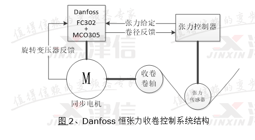 丹佛斯收卷張力控制系統(tǒng)由Danfoss驅(qū)動器(內(nèi)置MCO305運(yùn)動控制卡)、永磁同步電機(jī)和張力檢測控制器構(gòu)成,如上圖2所示。張力檢測控制器根據(jù)卷徑信號和張力傳感器的反饋信號,輸出一個(gè)模擬量作為丹佛斯驅(qū)動器的張力參考值,丹佛斯驅(qū)動器負(fù)責(zé)驅(qū)動永磁同步電機(jī),工作在閉環(huán)轉(zhuǎn)矩控制模式下。永磁同步電機(jī)轉(zhuǎn)子軸上安裝旋轉(zhuǎn)變壓器作轉(zhuǎn)子角度位置反饋。