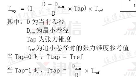 收卷張力錐度控制:有了當(dāng)前卷徑值,和張力錐度設(shè)定值,就能計(jì)算當(dāng)前張力。張力與卷徑的關(guān)系如圖3所示,當(dāng)張力錐度為0時(shí),張力保持恒定不變,相當(dāng)于恒張力控制;當(dāng)張力錐度為100%時(shí),卷徑每增大1倍,張力就下降一半,相當(dāng)于恒轉(zhuǎn)矩控制。計(jì)算公式如下: