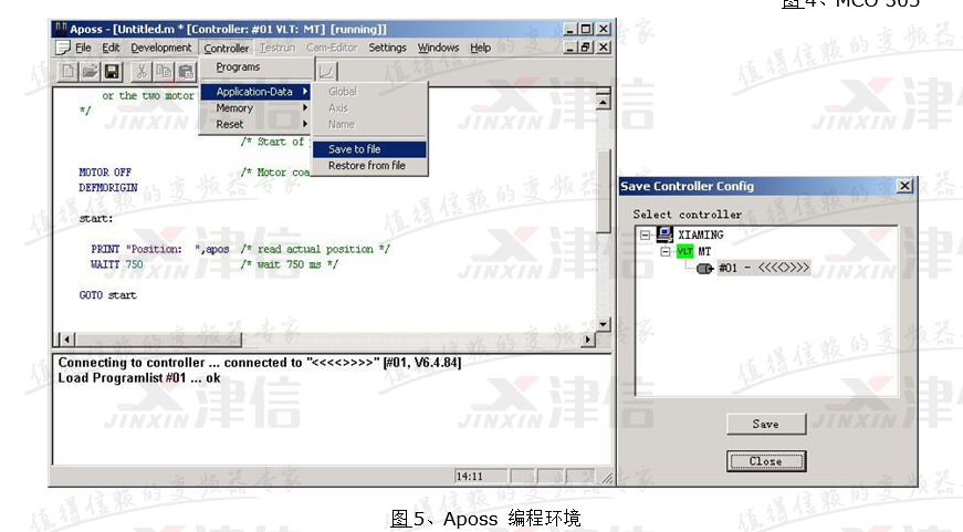 丹佛斯運(yùn)動控制器使用丹佛斯公司開發(fā)的Aposs運(yùn)動控制語言,其編程風(fēng)格模仿C語言,并提供多種便利的宏指令,其界面如下圖5所示: