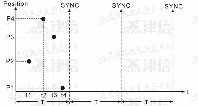10MC 接有四臺(tái)伺服驅(qū)動(dòng)器,T 為同步周期。在同步周期內(nèi),四臺(tái)伺服驅(qū)動(dòng)器分別在不同的時(shí)刻(t1、t2、t3、t4)接受到控制數(shù)據(jù),但是控制數(shù)據(jù)并沒有生效。當(dāng)伺服驅(qū)動(dòng)器接收到同步信號(hào)(SYNC),控制數(shù)據(jù)同時(shí)生效。