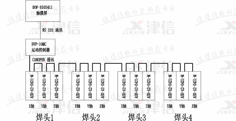 目前市場(chǎng)上以單焊頭超音波焊接機(jī)為主,但是單焊頭存在占用場(chǎng)地,效率低等缺點(diǎn),所以上海津信為客戶推出了以臺(tái)達(dá)10MC11T和ASD-A2-0421-M型伺服驅(qū)動(dòng)器為主開發(fā)的4焊頭超音波焊接機(jī)。