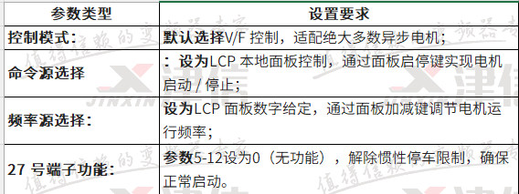 — 慣性停車端子:27 號(hào)端子默認(rèn)帶安全停車功能,需將參數(shù)5-12設(shè)為 0(無(wú)功能),避免啟動(dòng)被限制;
