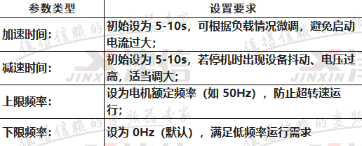 — 點(diǎn)動(dòng)(JOG)參數(shù):設(shè)置點(diǎn)動(dòng)頻率(5-10Hz)、點(diǎn)動(dòng)加減速時(shí)間(2-3s),方便現(xiàn)場(chǎng)轉(zhuǎn)向測(cè)試;