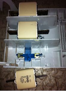 上圖為客戶現(xiàn)場(chǎng)使用的保險(xiǎn)絲,為普通的保險(xiǎn)絲。根據(jù)丹佛斯VLT軟啟動(dòng)器MCD500操作手冊(cè)(MG.17.K2.41)P23頁(yè)上說(shuō)明,軟起動(dòng)器的主回路器件是可控硅,由于可控硅無(wú)自關(guān)斷能力,因此在發(fā)生短路的時(shí)候無(wú)法靠電子線路快速響應(yīng)關(guān)斷的辦法進(jìn)行短路保護(hù),必須采用半導(dǎo)體器件保護(hù)用快速熔斷器進(jìn)行短路保護(hù)。顯然使用該保險(xiǎn)絲不符合丹佛斯軟啟動(dòng)器的要求。