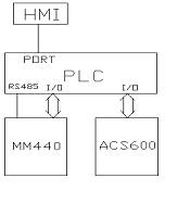 兩臺變頻器的起動/停止,故障報警全部通過數(shù)字I/O點控制;收卷跳舞輪位置控制由ACS600獨立完成;主機轉(zhuǎn)速由S7-200 PLC通過RS485串行通訊口給定。