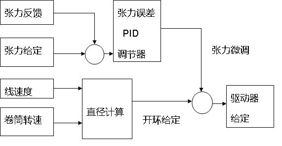 由于采用以上技術方案,使得排線平整,進而使收線伺服的控制是典型的中心卷繞控制。中心卷繞控制原理框圖如圖3所示。根據收線伺服當前實際轉速計算需要的開環(huán)給定量,同時通過跳舞輪反饋引入張力調節(jié),最終確定收線伺服驅動器的給定量。