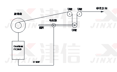如圖中所示;設(shè)備主要包含導(dǎo)輪支架,0-10V電位器,收卷電機(jī),丹佛斯FC360變頻器。FC360根據(jù)擺桿位置反饋控制放卷電機(jī)的轉(zhuǎn)速快慢和方向正反,使得放線速度和牽引速度保持同步,并使得擺桿在某個(gè)位置穩(wěn)定,放線速度穩(wěn)定恒速。