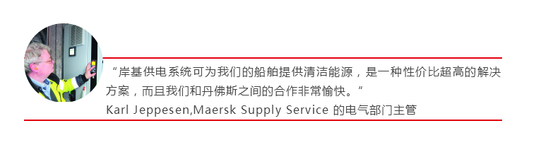 2017年初,Maersk Supply Service公司的電氣部門主管Karl Jeppesen針對公司管理提出了一個商業(yè)案例,即使用岸電為船舶供電,預計在6個月內(nèi)實現(xiàn)投資回報。很快,公司就通過了這個岸電項目,而且到2017年10月時整套系統(tǒng)就已完全投入運行。