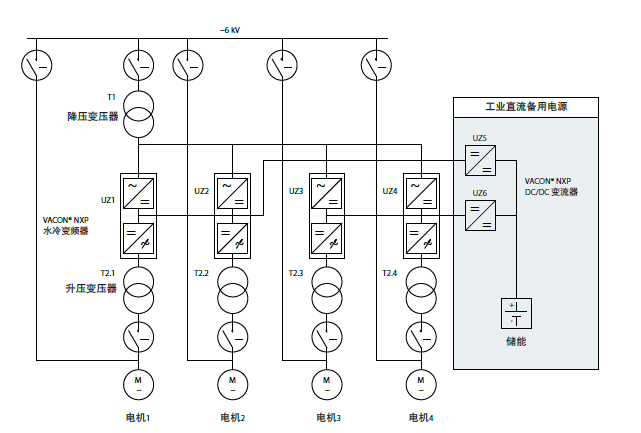 通過(guò)采用低壓水冷變頻器并結(jié)合“降壓-升壓”方案,來(lái)驅(qū)動(dòng)中壓電機(jī),IC-ART 和丹佛斯共同開發(fā)的直流備用電源系統(tǒng)來(lái)保證主電晃電或故障時(shí)的可靠持續(xù)運(yùn)行。
