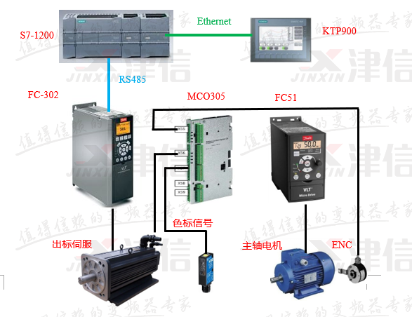 PLC與觸摸屏之間進(jìn)行Ethernet通訊,PLC與丹佛斯FC302變頻器之間進(jìn)行RS485通信,通過觸摸屏可以設(shè)置標(biāo)長、對(duì)標(biāo)位置、出標(biāo)起始位置等工藝參數(shù);FC302變頻器控制出標(biāo)伺服電機(jī),以保證出標(biāo)精度及響應(yīng)精度。