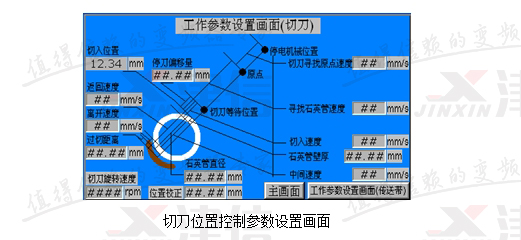石英切割機有三個控制部分構成:切刀旋轉控制、切刀位置控制和送料位置控制。切刀旋轉控制只要速度可調(diào)即可;切刀位置控制需要在切割石英管或石英棒的過程中控制其位置和不同段內(nèi)的速度,首先要保證切割產(chǎn)品的刀口質(zhì)量,同時要提高生產(chǎn)效率;送料位置控制需要每次往前送設定長度的石英管或石英棒,精度要求0.2毫米。