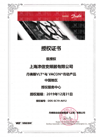 丹佛斯和偉肯變頻器服務(wù)中心授權(quán)證書